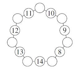 4.1 The diagram shows a heptagon with a line of three circles on each side. Each circle is to contain exactly one number. The numbers 8 to 14 are distributed as shown and the numbers 1 to 7 are to be distributed to the remaining circles. The total of the numbers in each of the lines of three circles is to be the same.