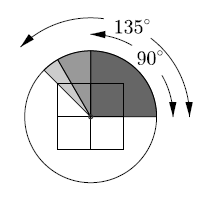 The straight edges of the shaded sector which occupies one third of the area of the circle will make an angle equal to one third of a complete revolution, that is, an angle of 13×360°=120°.