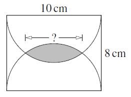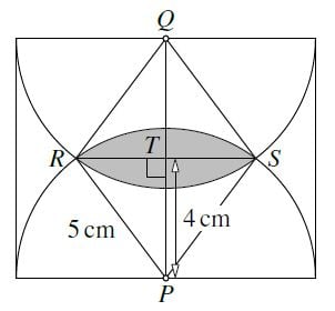 We now apply Pythagoras’ Theorem to the right-angled triangle PTR. This gives 42+x2=52, and hence x2=5242=2516=9. Therefore x=3. It follows that both RT and ST have length 3 cm. Hence the length of RS is 6 cm. Therefore the width of the overlap of the two semicircles is 6 cm.