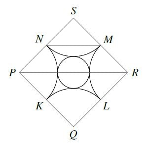 We see from the diagram that the quarter circles touch each other tangentially. Let the points where they touch be K, L, M and N. Let the centres of the quarter circles be P, Q, R and S, arranged as shown in the diagram.