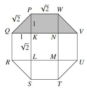 Because PQRSTUVW is a regular octagon, QKP, WNV, SLR and UMT are congruent right-angled isosceles triangles. We choose units so that the shorter sides of these triangles have length 1.