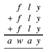 We note first that y = 5 is the only non-zero digit which, when it is multiplied by 3, has itself as the units digit. So there is a carry of 1 into the tens column. We note also that a = 1 or a = 2 as “fly” < 1000 and therefore 3 × “fly” < 3000.