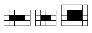 Three rectangular-shaped holes have been drilled passing all the way through a solid 3 x 4 x 5 cuboid. The diagrams show the front, side and top views of the resulting block.