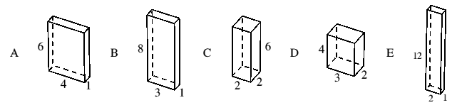 The surface areas of the cuboids are: A 68; B 70; C 56; D 52; E 76.