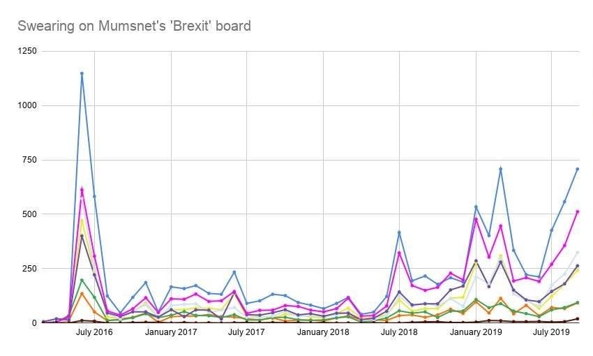 This graph made me smile. It shows the amount of swearing for different swear words appearing on the Brexit discussion pages on the social media site Mumsnet. I have removed the swear word labels, but you can probably guess some of them.