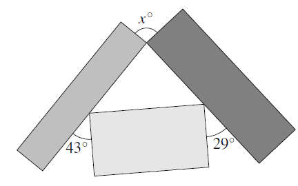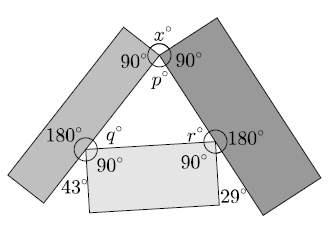 We let the angles in the triangle that is formed by the rectangles be p°, q° and r°, as shown in the figure.