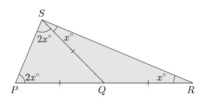 We now apply the fact that the angles of a triangle have sum 180° to the triangle PRS. This gives x+2x+3x=180. Hence 6x=180. Therefore x=30. It follows that QRS is 30°.