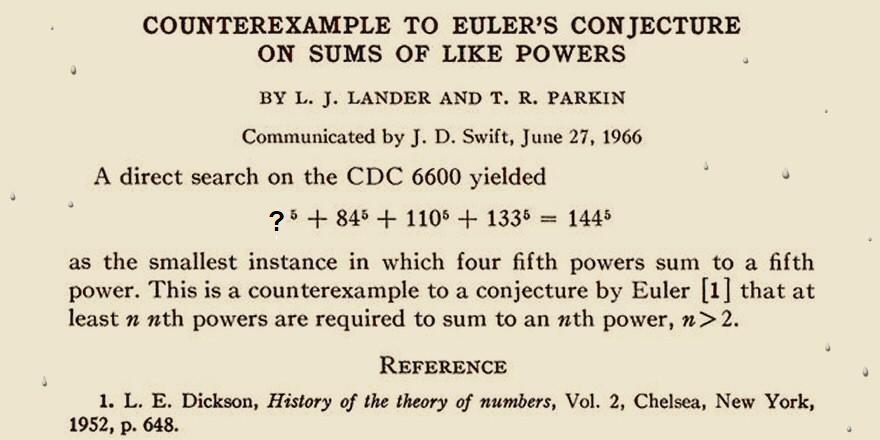 The mathematician Euler had conjectured (suggested) that you need at least four 4th powers to sum to a 4th power, or at least five 5th powers to sum to a 5th power, and so on. However, this paper gives an example where only four 5th powers sum to a 5th power (but I have replaced one of the numbers with a question mark). So the conjecture is wrong.