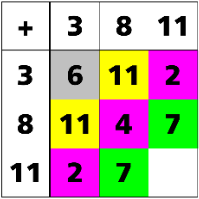 Some of the squares give unexpected results, e.g. 11 + 3 is normally 14 but here we have 2.