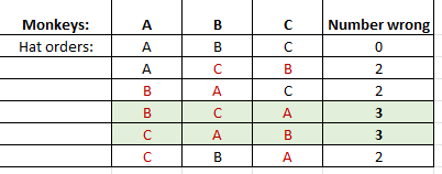 Of those six orders, only two of them involve all three monkeys picking up the wrong hat - or 13 of the options.