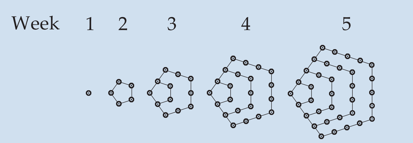 Each week it spreads from teacher to teacher, shown as the dots in the pentagonal diagrams.