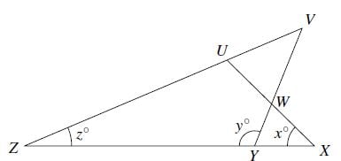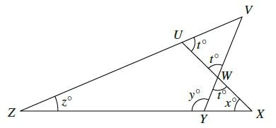 The four straight lines in the diagram are such that VU=VW. The sizes of UXZ, VYZ and VZX are x°,y°and z°.