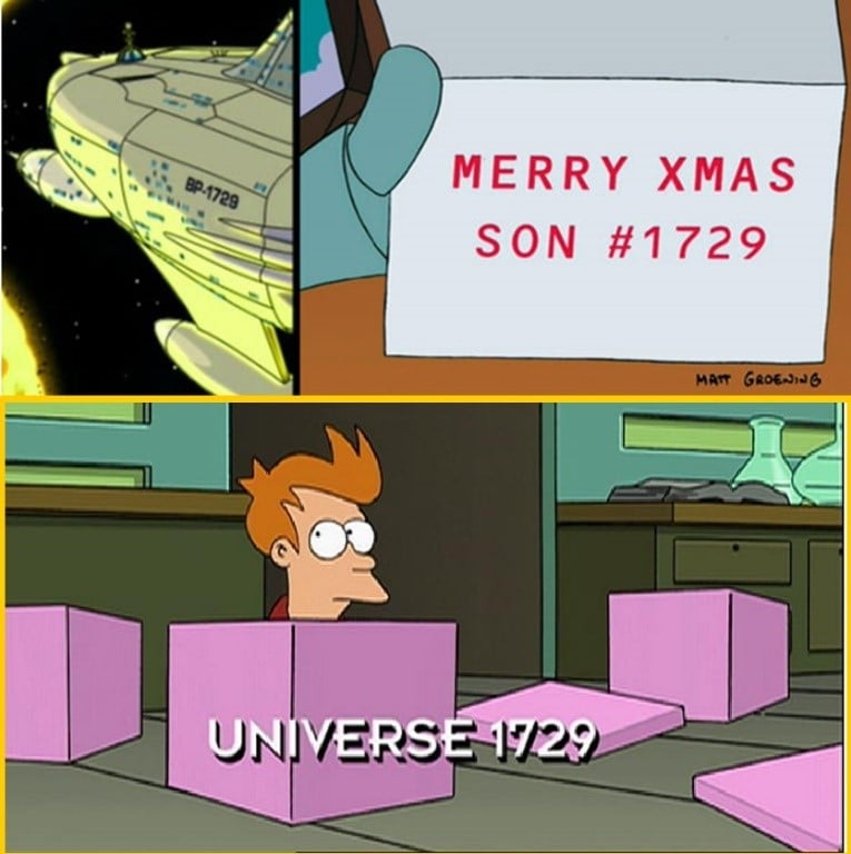 One of my favourite TV shows is Futurama. Many of the writers are mathematicians, and I met them a few years ago when I was writing “The Simpsons and Their Mathematical Secrets” (which has three chapters about Futurama). Because the writers admire Ramanujan, they featured 1,729 in three different episodes. Here are some stills from those episodes.