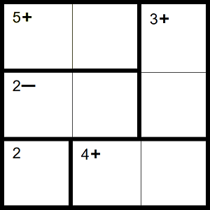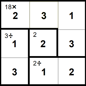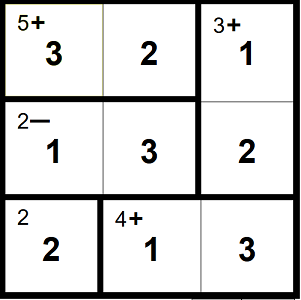 4. Each marked region (or cage) contains a target number and a mathematical operation. The numbers in the cage must add up, subtract, multiply or divide to give the target number.