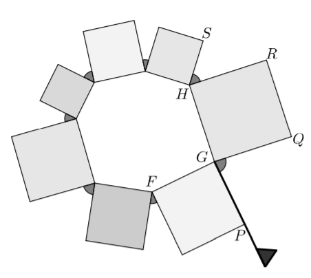 The sum of the angles at the vertex G is 360°. Now FGPand∠QGH are angles of a square, and so are each 90°. It follows that PGQ+HGF=360°90°90°=180°. Therefore