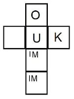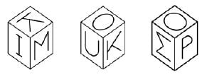 (B) We see from the left hand diagram that K is not opposite either I or M, and from the middle diagram that it is not opposite either O or U. Therefore K must be opposite P. So neither K nor P is opposite U. From the middle diagram O is also not opposite U. So U is opposite either I or M. But if U is opposite I, then O must be opposite M, and this possibility is ruled out by the right hand diagram. So U must be opposite to M (and, also, I is opposite O).