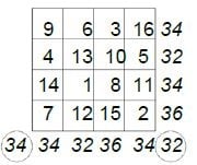 If a row, column or diagonal already sums to 34, then you probably don’t need to adjust anything, so cross out all the numbers in those columns, rows and diagonal. The numbers that you need to swap will be among whatever numbers are left.