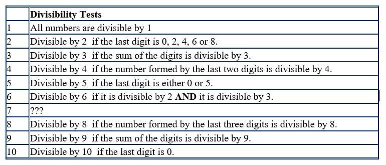 As you will know, there are various tests for deciding whether or not a number is divisible by 1, 2, 3, 4, 5, 6, 8, 9, 10, 11 and 12.