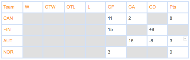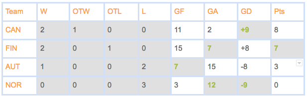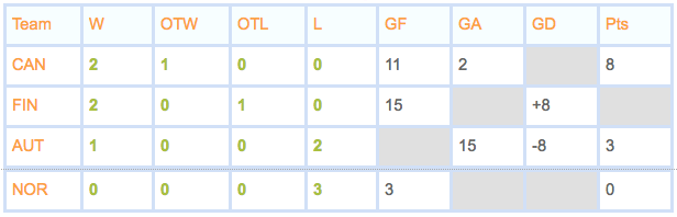To win eight points, Canada must have two wins (against Austria and Norway) and an OTW. Canada’s OTW was therefore over Finland, making the left-hand part of the table look like this: