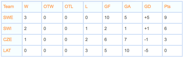 In the 2014 Winter Olympics in Sochi, the final table in Group C (Sweden, Switzerland, Czech Republic, Latvia) looked like this: