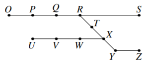 Jo must go through the junction stations R and X more than once. If Jo does not start or finish at O, she will have to go through P more than once. If she does not start or finish at U she will have to go through V more than once. If she starts at O and finishes at U, or vice versa, she will have to go through Y more than once. It follows that Jo has to go through at least three stations more than once. So this is the smallest number of stations Jo must go through more than once.