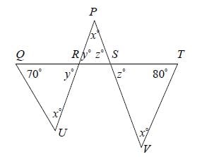 (1) x + y + z = 180, (2) x + y + 70 = 180, (3) and x + z + 80 = 180.
