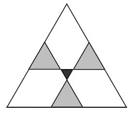 The three grey regions are equilateral triangles with sides of length 5 cm and the central black region is an equilateral triangle with sides of length 2 cm.