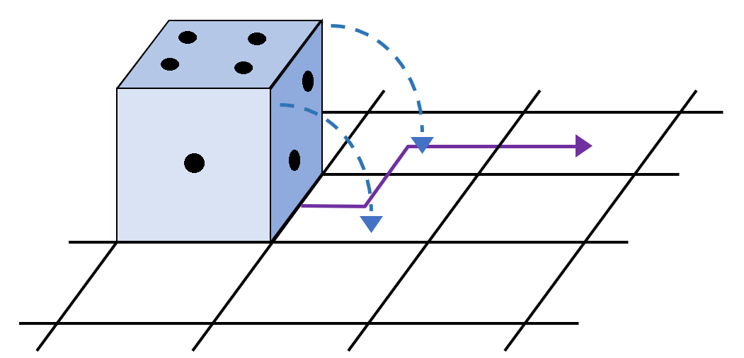 1.1. Roll the dice in the way shown by the arrows – in other words, the dice moves from one square to the next by rotating by 90 degrees around one edge. When it lands on the final square, what number will be on top?