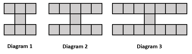 Each diagram has 4 arms, each having the same number of squares as the number of the diagram. And then we have 3 additional squares connecting the four arms.