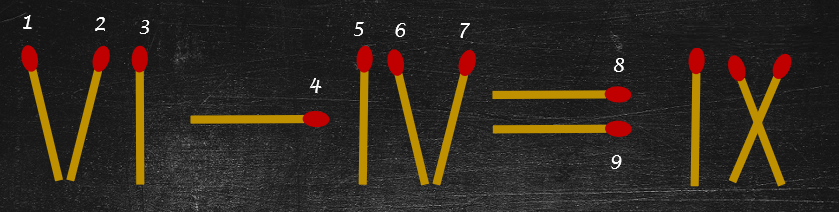 3.1. The matches are arranged to form Roman numerals, but obviously six minus four is not nine. Which matchstick (labelled 1 to 9) would you need to move in order to make the equation correct?
